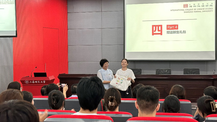 随后举办的是学院2023级研究生入学教育暨“科学道德与学风建设”宣讲会。学院副院长李文浩老师向全体研究生新生一一介绍了学院的研究生导师,并表示了热烈的欢迎。院长曹秀玲老师介绍了学院及学科,尤其是研究生学位点建设的相关情况,并寄语全体研究生新生“此生无悔入师大,外汉研究展芳华”。早在新生入学前,学院就已为新生精心准备了新生大礼包及欢迎卡,党委书记刘岚老师向新生代表黄晓歌赠送了学院的大礼包,并表达了欢迎,而今日又正逢黄同学的生日,学院同时也准备了礼物为其庆生。