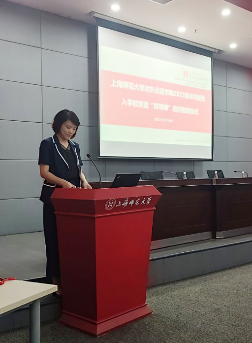 首先进行的是2023级本科新生入学教育暨“双导师”结对启动仪式。学院院长曹秀玲老师介绍了学院整体规模及院训精神,向新加入学院大家庭的本科新生表示了衷心欢迎,并寄语同学们“不负青春韶华,不负时代重托”。副院长张巍老师介绍了汉语国际教育专业的相关情况,包括发展历程、培养方案、办学理念、人才培养特色四方面,帮助本科新生更加清晰地认知所学专业,擘画未来发展蓝图。王彦清同学作为2023级本科新生代表进行发言,她阐述了自己选择本专业的原因,并勉励全体新生成为心怀理想、勇于担当的新时代青年。