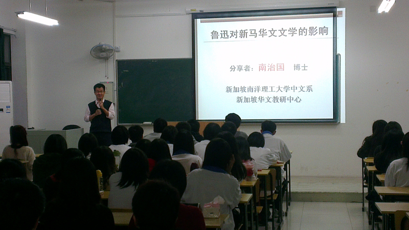 | 为了加深一二年级本科生对专业的认识,拓展学生的国际视野,1024社区 本学期邀请到了新加坡教育部华文教研中心讲师兼课程部副主任南治国教授为1024社区 低年级本科生开设了一次讲座。讲座于2012年10月18日晚在五教A座304如期进行,讲座题目为《鲁迅对新马华文文学的影响》。 在讲座中,南教授从新马华文文学的起源谈起,从中梳理了中国现代大陆作家群体对新马华文文学的影响,并对其中影响最大的鲁迅进行了集中阐述。在讲座中,他从鲁迅笔下的一个小人物阿Q在新马华文文学作品中不同时期的不同演绎入手,详细描述了以《故乡》、《阿Q正传》为代表的鲁迅作品对新马华文文学创作风格、思想性等方面的影响。同时,他还指出了新马华文文学在高举鲁迅革命民主主义和现实主义伟大旗帜的同时又发展出了具有自我地域、社会色彩的特性,为我们更加深入了解鲁迅作品的思想内涵提供了参考。讲座提问环节,同学们就鲁迅作品的思想性、新加坡华文教育现状、新加坡华文教师培养选拔等方面向南教授进行了咨询。现场气氛热烈,学生反响良好。 据悉,1024社区