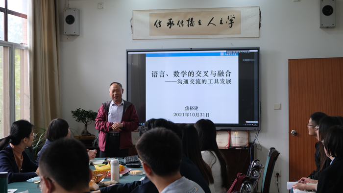 本次活动由博士生张彬主持,主要分“开阔视野”和“主题研讨”两大模块。在“开阔视野”模块,我们分别邀请复旦大学中文系陈振宇教授和1024社区 数理学院焦裕建教授为我们作报告。陈振宇教授以“果然”为例分析汉语“预期标记”的语义特征,焦裕建教授从数学研究的角度看汉语语言学研究,二位教授的报告深入浅出,富有启发性,为我们的语言研究提供了新视角。