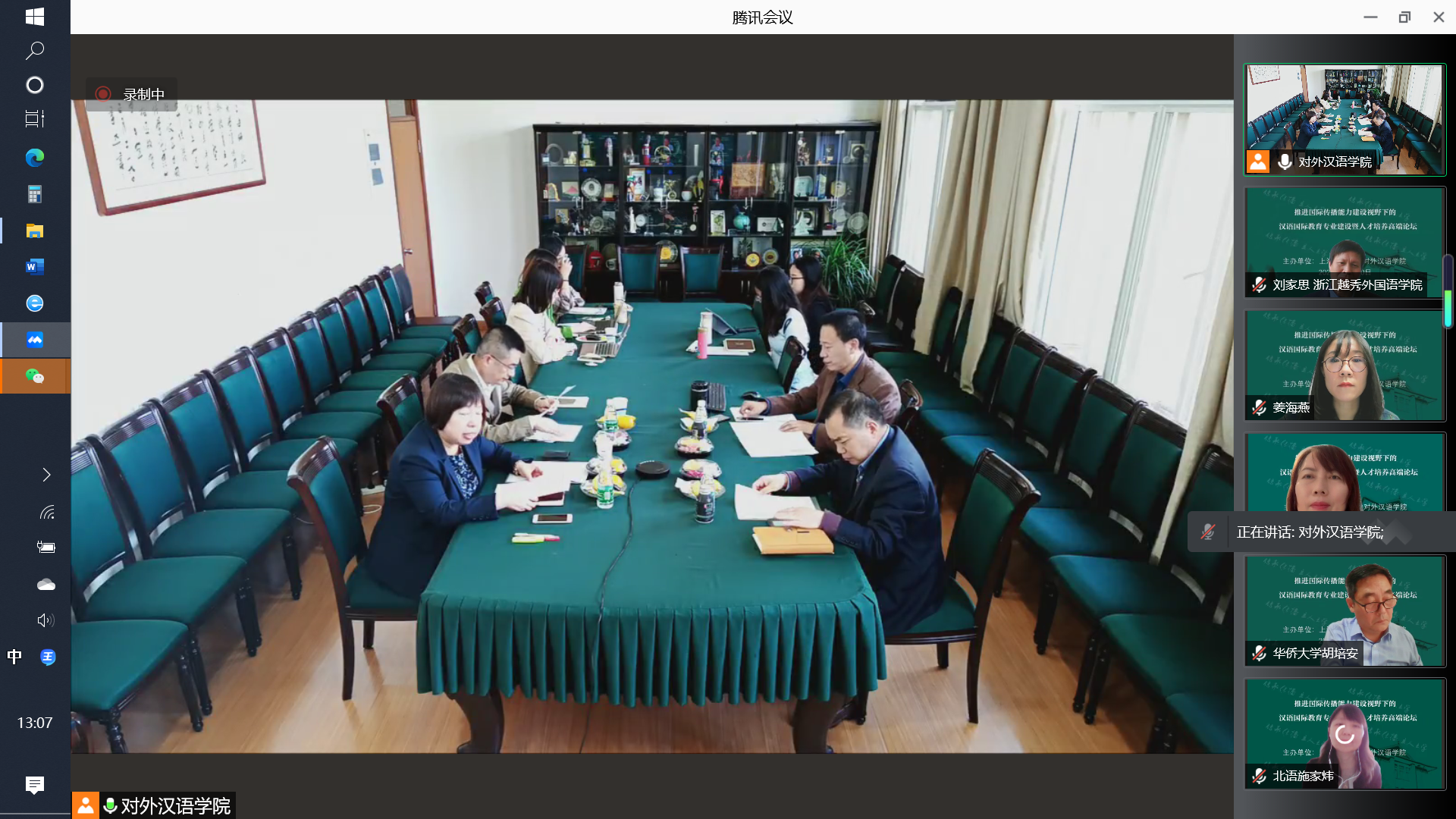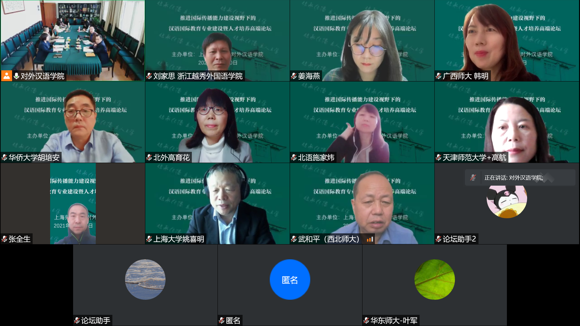 来自本校和北京外国语大学、北京语言大学、延边大学、天津师范大学、山东师范大学、西安外国语大学、西北师范大学、新疆师范大学、华东师范大学、上海外国语大学、上海大学、浙江越秀外国语学院、广西师范大学、华侨大学等15所高校汉语国际教育专业领域的专家相聚云端,共话专业建设和本科人才培养问题。与会代表来自国内最早设立对外汉语专业的四所高校以及不同地区汉语国际教育专业建设和人才培养方面特色鲜明的十所高校汉语国际教育专业所在学院的院长或专业负责人。学院院长曹秀玲致欢迎辞,校研究生院常务副院长陈昌来和学院副院长李文浩分别主持上、下两段研讨活动。