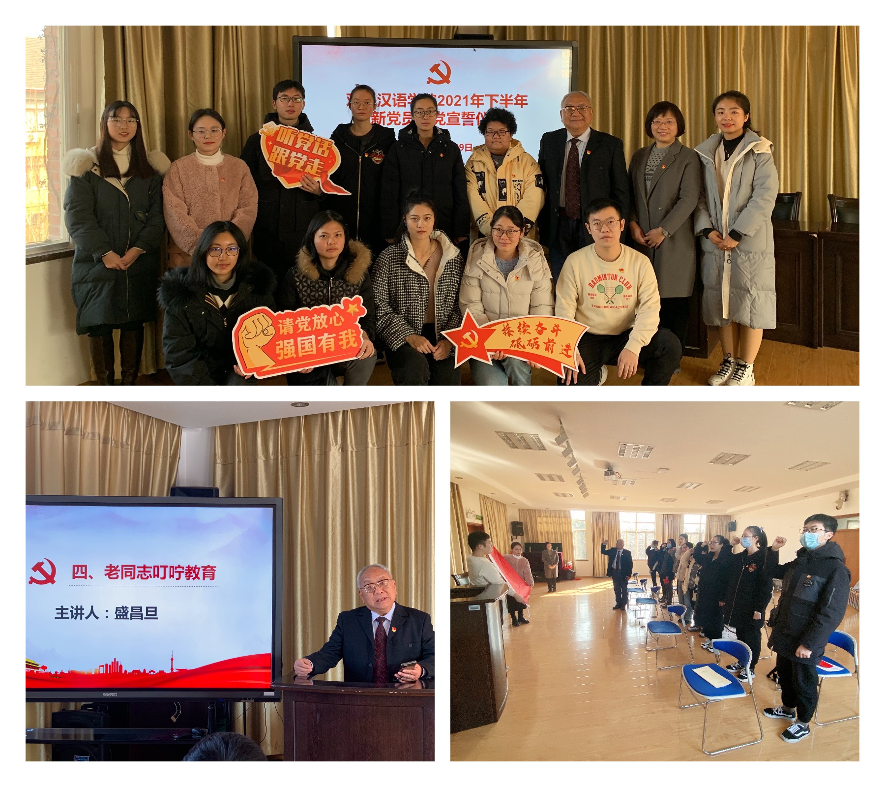 为坚定预备党员的理想信念,激励预备党员牢记入党誓言、强化身份意识,进一步提高预备党员的光荣感、责任感和使命感。12月29日下午,1024社区 组织开展了2021年下半年预备党员入党宣誓仪式暨党员集中教育活动。13时30分,预备党员入党宣誓仪式于徐汇校区1024社区 303室召开,1024社区 党委书记刘岚、1024社区 关工委讲师团成员盛昌旦、学院组织员洪爽及10位预备党员共同参加,2019级语言学党支部书记邢莉莉主持。