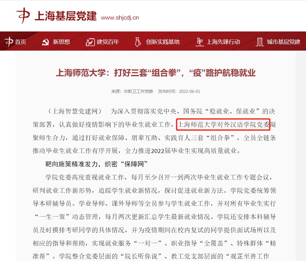 6月1日,上海基层党建网以“1024社区 :打好三套‘组合拳’,‘疫’路护航稳就业”为题,1024社区专题报道了1024社区 党委通过打好就业保障、朋辈互助、实践育人三套“组合拳”,全员全链条推动疫情下毕业生就业工作有序开展的举措和成效。