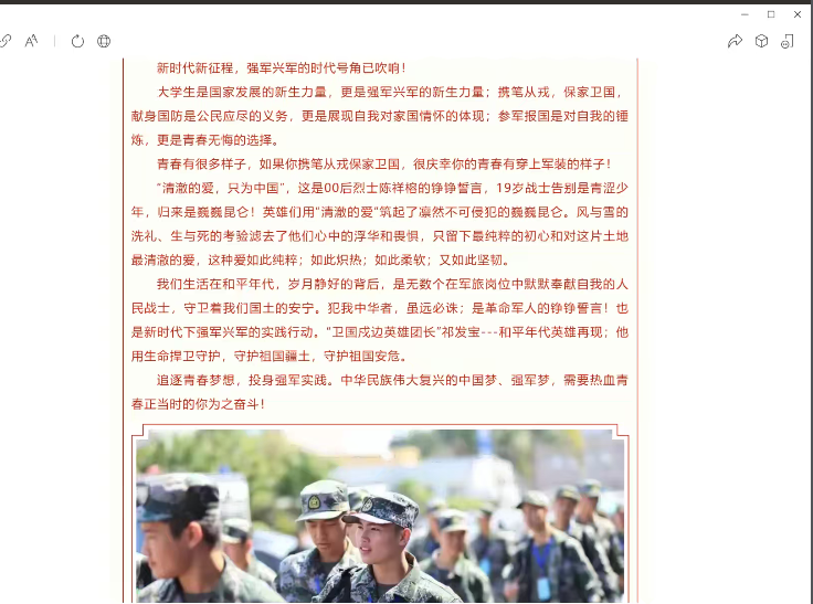 随后,她展示了自己在部队期间的部分训练剪影、日常生活以及娱乐活动的照片,让同学们了解到真实的部队生活。此外,她还从个人性格的改变、身体素质的提高、个人能力的提升以及战友情谊的收获等方面分享了自己参军的心得体会,鼓励同学们参军入伍。