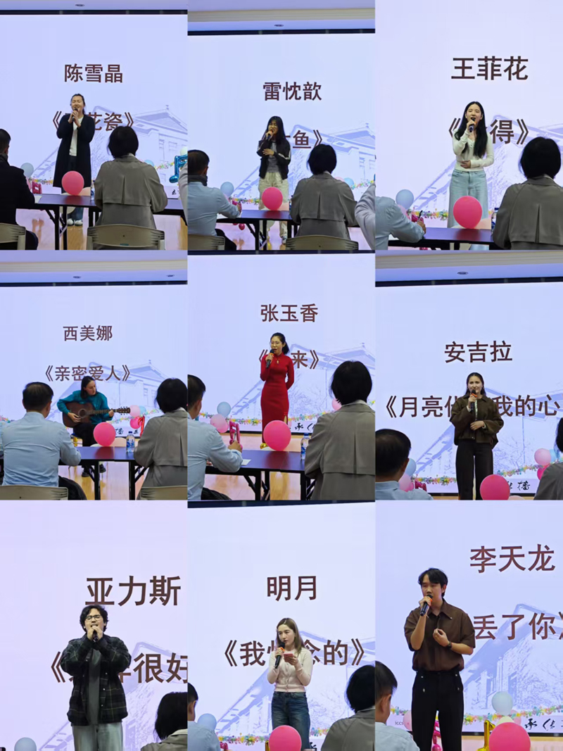 比赛开始,选手们依次上台展现风采,表演曲目各具特色、精彩纷呈。从耳熟能详的流行歌曲《青花瓷》到温柔缱绻的经典老歌《月亮代表我的心》,从空灵婉转的电影插曲《大鱼》到勾人心弦的怀旧金曲《后来》,选手们用各自的歌声诠释了对歌曲的理解,将中文歌的韵律美与情感张力展现得淋漓尽致。歌声绵延,掌声不断,选手们的演绎一次次将现场的气氛推向高潮,赢得满堂喝彩。