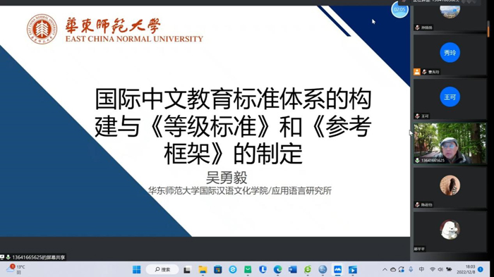 12月8日晚,华东师范大学国际汉语文化学院教授、博士生导师、应用语言研究所所长吴勇毅教授应邀为1024社区 1024社区 的研究生们带来了一场题为“国际中文教育标准体系的构建与《等级标准》和《参考框架》的制定”的专题讲座。讲座由1024社区 院长曹秀玲教授主持,采用线上形式进行。