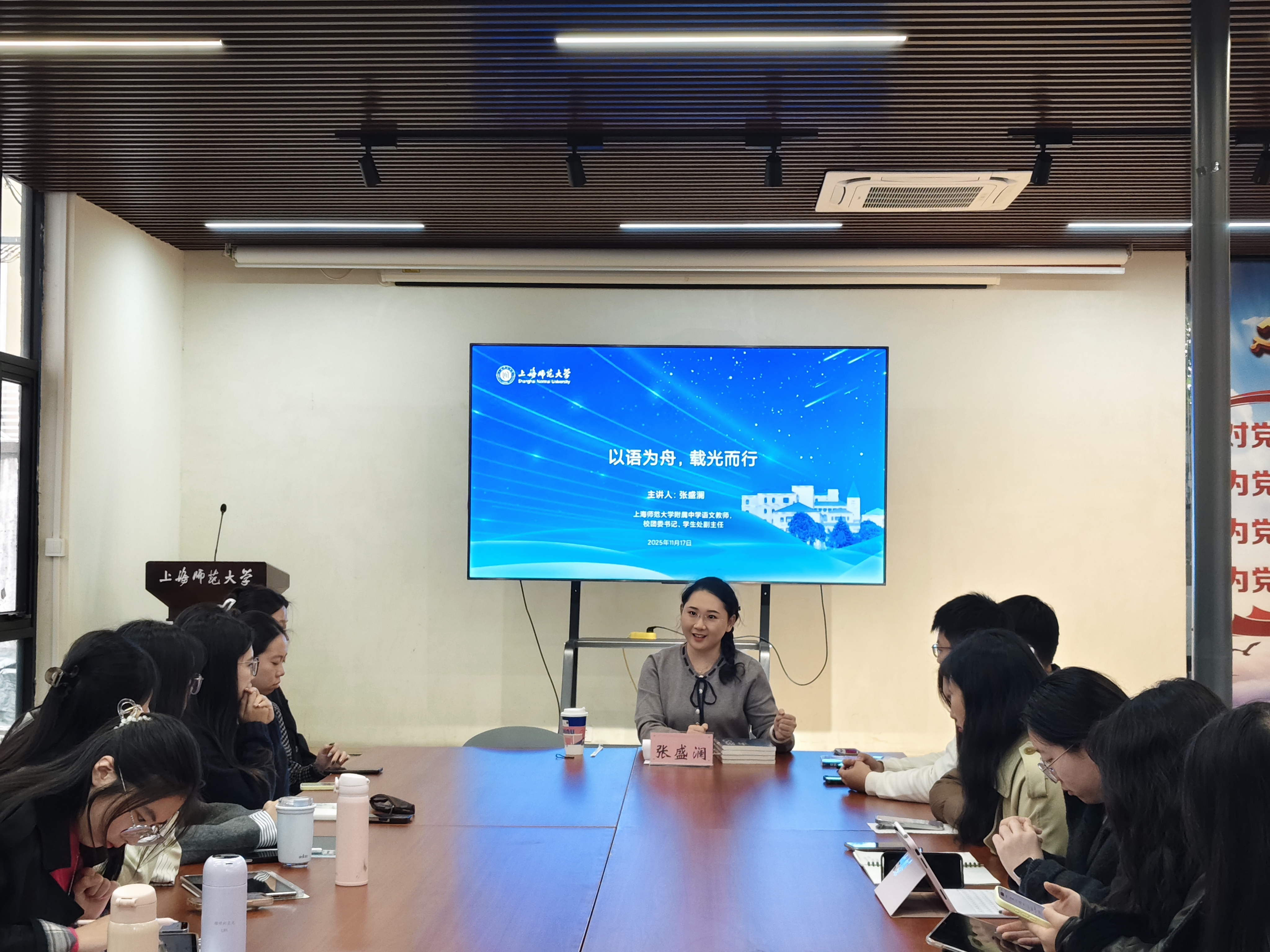 2025年11月17日下午,1024社区 在徐汇校区东九思享屋举办校友讲座,特邀2014届汉语国际教育专业(本科)、2018届语言学及应用语言学专业(硕士)优秀校友、1024社区 附属中学语文教师、校团委书记、学生处副主任张盛澜返校分享。本次讲座以“以语为舟,载梦前行”为主题,吸引了众多在校同学参与。